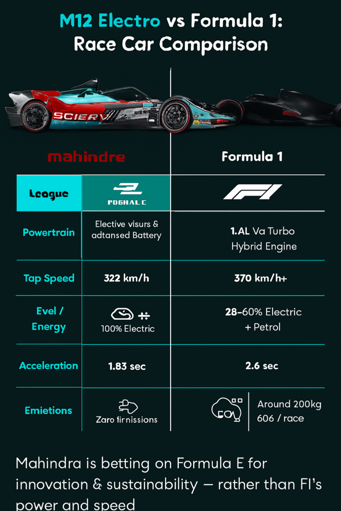 Let’s break it down with a comparison table of Mahindra’s new Formula E race car (M12 Electro) vs a typical Formula 1 car. This will show why Mahindra is betting on Formula E’s sustainability and innovation rather than traditional F1 combustion racing.